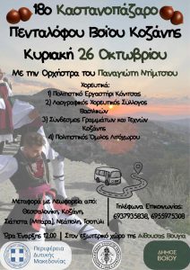 Aπό τον Εκπολιτιστικό Σύλλογο Πενταλόφου Κυριακή 26 Οκτωβρίου Με την ορχήστρα του Παναγιώτη Ντίμτσιου Συμμετέχουν τα χορευτικά: Πολιτιστικό Εργαστήρι Κόνιτσας, Λαογραφικός Χορευτικός Σύλλογος Βασιλικών, Σύνδεσμος Γραμμάτων και Τεχνών Κοζάνης και Πολιτιστικός Όμιλος Λιτόχωρου Ώρα έναρξης: 12:00 Στον εξωτερικό χώρο της Αίθουσας «Βούγια» Λεωφορεία από: Θεσσαλονίκη – Κοζάνη – Σιάτιστα (Μπάρα) – Νεάπολη – Τσοτύλι Ελάτε […]