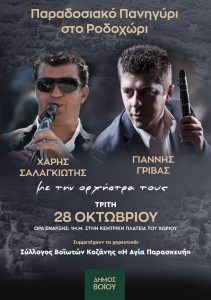 Δήμος Βοΐου: Παραδοσιακό πανηγύρι στο Ροδοχώρι Τρίτη 28 Οκτωβρίου Στην Κεντρική Πλατεία του Χωριού Ώρα Έναρξης: 13:00 Με την Ορχήστρα του Χάρη Σαλαγκιώτη και του Γιάννη Γρίβα Θα συμμετέχει το χορευτικό του Συλλόγου Βοϊωτών Κοζάνης «Η Αγία Παρασκευή» Μια γιορτή παράδοσης και κεφιού, για όλους τους δημότες και τους επισκέπτες!