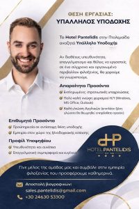 Ζητείται υπάλληλος (άνδρας) για την Υποδοχή του ξενοδοχείου Παντελίδης στην Πτολεμαΐδα . Απαραίτητα Προσόντα Εκπληρωμένες στρατιωτικές υποχρεώσεις (απαραίτητο) Πολύ καλή γνώση χειρισμού Η/Υ απαραίτητη ( Windows, MS Office, Ms Outloock ) Καλή γνώση Αγγλικών (επιπλέον ξένη γλώσσα θα θεωρηθεί επιπρόσθετο προσον) προϋπηρεσία επιθυμητή( στην υποδοχή αλλά και εστίαση ξενοδοχείου ) . Για αποστολή βιογραφικών, επικοινωνήστε μαζί μας με e-mail στο