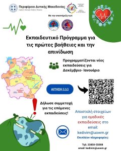 Το Κέντρο Επιμόρφωσης και Διά Βίου Μάθησης (ΚΕΔΙΒΙΜ) του Πανεπιστημίου Δυτικής Μακεδονίας, σε συνεργασία με την Περιφέρεια Δυτικής Μακεδονίας, συνεχίζει δυναμικά την υλοποίηση του Δωρεάν Εκπαιδευτικού Προγράμματος Πρώτων Βοηθειών και Απινίδωσης, με νέες εκπαιδεύσεις που προγραμματίζονται για τους μήνες Δεκέμβριο 2025 και Ιανουάριο 2026. Μέχρι σήμερα, 1.100 πολίτες από όλη τη Δυτική Μακεδονία έχουν ήδη […]