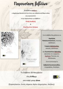 Οι Εκδόσεις Κυβέρτι, η Κασσιανή Μαρτινάκη και ο Δημήτρης Παπακωνσταντίνου, σας προσκαλούν στην παρουσίαση των βιβλίων: «ριπή ανοδική» της Κασσιανής Μαρτινάκη και «στη γη του ανέμου πνοές-φωνές της ποίησης» της Κασσιανής Μαρτινάκη και του Δημήτρη Παπακωνσταντίνου. Σάββατο 15 Νοεμβρίου, 6:00μμ, στο καφέ μπαρ Δέκα, Στρατηλατών (εντός πάρκου Αγ. Δημητρίου) Κοζάνη. Τα βιβλία θα παρουσιάσουν: Γιώργος Δελιόπουλος, ποιητής, φιλόλογος και διευθυντής του περιοδικού […]