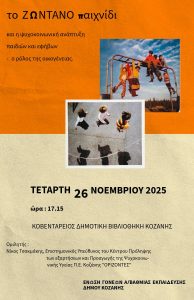Η Ένωση Συλλόγων Γονέων και Κηδεμόνων Α/θμιας Εκπαίδευσης Δήμου Κοζάνης διοργανώνει εκδήλωση-συζήτηση με θέμα “Το Ζωντανό παιχνίδι και η ψυχοκοινωνική ανάπτυξη παιδιών και εφήβων, ο ρόλος της οικογένειας”. Η εκδήλωση θα πραγματοποιηθεί στις 26 Νοεμβρίου 2025 και ώρα 17:15, στη Κοβεντάρειο Δημοτική Βιβλιοθήκη Κοζάνης. Ομιλητής θα είναι ο κ. Τσακμάκης Νίκος Επιστημονικός Υπεύθυνος του Κέντρου […]
