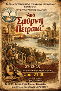 Ο Σύλλογος Μικρασιατών Πτολεμαΐδας παρουσιάζει την μουσικοθεατρική παράσταση ” Από Σμύρνη Πειραιά”. Ένα ταξίδι από τις γειτονιές της Σμύρνης στους προσφυγικούς συνοικισμούς και στην αποτύπωση του καημού, της ανάγκης, του έρωτα και της αναζήτησης μέσα από τα τραγούδια. Η γέννηση του ρεμπέτικου τραγουδιού που αποτέλεσε τον “σεισμογράφο” της εποχής, μέσα από το οποίο αποτυπώθηκαν η […]