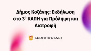 Το 3ο ΚΑΠΗ του Δήμου Κοζάνης σας προσκαλεί στην ενημερωτική εκδήλωση με θέμα «Πρόληψη και Διατροφή στην Τρίτη Ηλικία», η οποία θα πραγματοποιηθεί την Παρασκευή 3 Απριλίου 2026 και ώρα 10:30 το πρωί, με ελεύθερη είσοδο. Οι εισηγητές θα είναι από την Εταιρεία Ψυχικής Υγείας & Κοινωνικής Αποκατάστασης (ΕΨΥΚΑ). Σας περιμένουμε!
