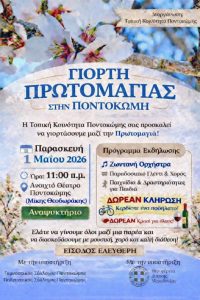 Η Τοπική Κοινότητα Ποντοκώμης διοργανώνει την Γιορτή Πρωτομαγιάς και προσκαλεί τον κόσμο να γιορτάσει μαζί της την Παρασκευή 1 Μαΐου 2026, στις 11:00 π.μ., στο Ανοιχτό Θέατρο Ποντοκώμης «Μίκης Θεοδωράκης». Το πρόγραμμα της εκδήλωσης περιλαμβάνει: Ζωντανή ορχήστρα Παραδοσιακό γλέντι και χορό Παιχνίδια και δραστηριότητες για παιδιά Δωρεάν κλήρωση με δώρο ένα ποδήλατο Δωρεάν κρασί για […]