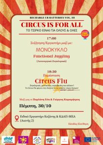 Η S.A.N. Team της ΑΡΣΙΣ Κοζάνης σας καλεί στην εκδήλωση Circus is for All, του 3ου Recharge Your Batteries Festival, την Πέμπτη 30 Οκτωβρίου, στις 17:00, στο χώρο του Ειδικού Εργαστηρίου Κοζάνης και του ΚΔΑΠ-μεΑ Δήμου Κοζάνης (Αιανής 2). Στόχος της εκδήλωσης είναι να ανακαλύψουμε μαζί πώς η τέχνη του τσίρκο μπορεί να αποτελέσει […]