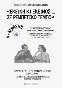Το Δημοτικό Ωδείο Κοζάνης παρουσιάζει: «Εκείνη κι Εκείνος… σε ρεμπέτικο τέμπο». Μια βραδιά αφιερωμένη στις ανθρώπινες σχέσεις, όπως τις αποτύπωσαν οι δημιουργοί του ρεμπέτικου μέσα από στίχους γεμάτους πάθος, χιούμορ, έρωτα και νοσταλγία. Συμμετέχει το Ορχηστρικό Σύνολο Παραδοσιακής Μουσικής «Α+Συγκέραστοι». Οι «Α+Συγκέραστοι» έχουν ήδη στο ενεργητικό τους μια σειρά από επιτυχημένες συναυλίες, πάντα με στόχο […]