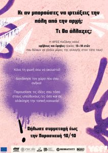 Κι αν μπορούσες να φτιάξεις την πόλη από την αρχή; Τι θα άλλαζες; Η ΑΡΣΙΣ Κοζάνης καλεί εφήβους και έφηβες ηλικίας 13–18 ετών που θέλουν να γίνουν μέρος της αλλαγής στον τόπο τους! Μέσα από σταθερές συναντήσεις θα δημιουργηθούν ομάδες νέων που θα έχουν την ευκαιρία να: μάθουν, να εκφραστούν και να ενδυναμωθούν, διεκδικήσουν το […]