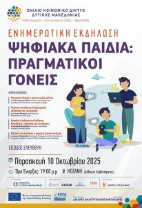 Το Ενιαίο Κοινωνικό Δίκτυο Δυτικής Μακεδονίας διοργανώνει την Παρασκευή 10 Οκτωβρίου 2025, στις 19:00 μ.μ., στην Αίθουσα Κοβεντάρειος στην Κοζάνη, μια ιδιαίτερα ενδιαφέρουσα ενημερωτική εκδήλωση με τίτλο «Ψηφιακά Παιδιά: Πραγματικοί Γονείς». Η εκδήλωση στοχεύει στην ενημέρωση και ευαισθητοποίηση των γονέων σχετικά με τον ψηφιακό εθισμό, την ψυχική υγεία των παιδιών, τη δημιουργική αξιοποίηση της τεχνολογίας, […]