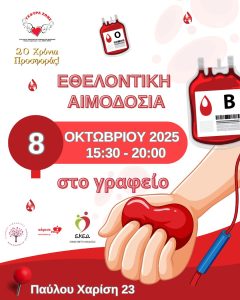 Την Τετάρτη 8 Οκτωβρίου 2025 από τις 15:30–20:00 (προσέλευση μέχρι 19:30) γίνεται αιμοδοσία στο γραφείο (Π. Χαρίση 23) με την συνεργασία της Αιμοδοσίας του Γ.Ν. Κοζάνης. Κάνε αυτό που θα ήθελες να κάνουν, στα δύσκολα, και οι άλλοι για σένα. «Να είσαι εκεί για τον Άλλον. Δώσε Αίμα. Μοιράσου τη Ζωή» Σκέψου ότι ένας […]