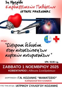 Η Διοίκηση του Γενικού Νοσοκομείου Κοζάνης «ΜΑΜΑΤΣΕΙΟ» και η Καρδιολογική Κλινική του Νοσοκομείου σας προσκαλούν στην 1η Ημερίδα Καρδιαγγειακών Παθήσεων Δυτικής Μακεδονίας με θέμα: «Σύγχρονα Δεδομένα στην Αντιμετώπιση των Αορτικών Ανευρυσμάτων» Η ημερίδα τελείται υπό την αιγίδα του Ιατρικού Συλλόγου Κοζάνης και θα πραγματοποιηθεί το Σάββατο 1 Νοεμβρίου 2025, ώρα 10:00 π.μ. στην Αίθουσα Συνεδριάσεων […]