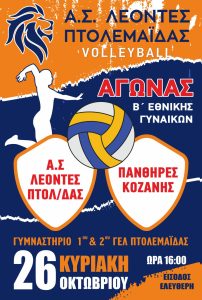Ο Α.Σ. Λέοντες Πτολεμαΐδας υποδέχεται τις Πανθήρες Κοζάνης σε αγώνα για το πρωτάθλημα της Β΄ Εθνικής Κατηγορίας Γυναικών στο βόλεϊ. Η αναμέτρηση θα διεξαχθεί την Κυριακή 26 Οκτωβρίου, στις 16:00, στο Γυμναστήριο του 1ου & 2ου ΓΕΛ Πτολεμαΐδας. Η είσοδος είναι ελεύθερη, και η διοίκηση της ομάδας καλεί τους φιλάθλους να στηρίξουν με την παρουσία […]