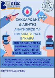 Ενημέρωση “Σακχαρώδης διαβήτης – αναγνώρισε τα σημάδια, δράσε έγκαιρα”, την Παρασκευή 14 Νοεμβρίου, στο Περιφερειακό Ιατρείο Βελβεντού .