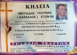 Έφυγε από την ζωή, σε ηλικία 66 ετών, ο δάσκαλος Μιλτιάδης Γκούβας (δάσκαλος). Η κηδεία του θα γίνει την Κυριακή 30/11 στις 16:00 στην Γαλατινή.