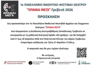 Σας προσκαλούμε στο 1ο Πανελλήνιο Μαθητικό Φεστιβάλ Αρχαίου και Σύγχρονου Θεάτρου “ΈΡΑΜΑΙ ΜΕΓΑ”που θα διεξαχθεί από 21 έως 30 Απριλίου 2026 στο Πολιτιστικό Κέντρο του Δήμου Γρεβενών. Εναρκτήρια εκδήλωση την Τρίτη 21 Απριλίου 11:30π.μ.
