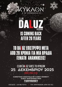Ένα από τα πιο εμβληματικά club της Κοζάνης, το DALUZ, επιστρέφει ύστερα από 20 ολόκληρα χρόνια, για μία και μοναδική βραδιά που αναμένεται να ξυπνήσει έντονες μνήμες στους παλιούς θαμώνες και να κεντρίσει το ενδιαφέρον των νεότερων. Η μεγάλη επιστροφή θα πραγματοποιηθεί την Πέμπτη 25 Δεκεμβρίου 2025, στο ΚΥΚΛOΝ by Kosmokinisi, με τις πόρτες να […]