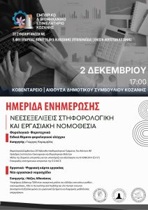 Το Επιμελητήριο Κοζάνης, σε συνδιοργάνωση με την Ε.Φ.Ε.Ε. Επαρχίας Βοΐου, την Ε.Φ.Ε.Ε. Ν. Κοζάνης (Πτολεμαΐδα) και την Ένωση Λογιστών Κοζάνης, διοργανώνει ενημερωτική ημερίδα με θέμα: «Νέες Εξελίξεις στη Φορολογική και Εργασιακή Νομοθεσία» την Τρίτη 2 Δεκεμβρίου, ώρα 17:00 , στην αίθουσα συνεδριάσεων Διοικητικού Συμβουλίου Κοζάνης στο Κοβεντάρειο (Χ. ΜΟΥΚΑ 7, ΚΟΖΑΝΗ). Η ημερίδα απευθύνεται σε λογιστές, φοροτεχνικούς, οικονομολόγους, […]