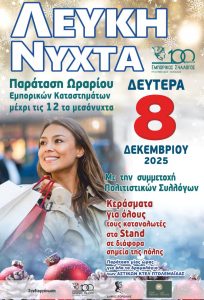 Ο Εμπορικός Σύλλογος Πτολεμαΐδας – Εορδαίας σε συνδιοργάνωση με την Περιφέρεια Δυτικής Μακεδονίας, το Εμπορικό και Βιομηχανικό Επιμελητήριο Κοζάνης και τον Δήμο Εορδαίας, σας προσκαλούν, την Δευτέρα 8 Δεκεμβρίου 2025 στην “Λευκή Νύχτα” στα πλαίσια της στήριξης της τοπικής μας αγοράς. Με την συμμετοχή όλων των πολιτιστικών συλλόγων της Εορδαίας, που στηρίζουν κάθε προσπάθεια του συλλόγου μας, με μουσική, […]