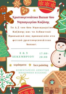 Ο Σύλλογος Γονέων & το Διδακτικό Προσωπικό του 6ου Νηπιαγωγείου Κοζάνης σας προσκαλούν στο Χριστουγεννιάτικο Bazaar που θα πραγματοποιηθεί στην Κοβεντάρειο Δημοτική Βιβλιοθήκη Κοζάνης, Δευτέρα & Τρίτη 8-9 Δεκεμβρίου, 17:00 με 20:00. Face Painting για τα παιδιά & κεράσματα για όλους! Σας περιμένουμε.”