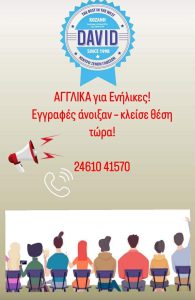 Νέα τμήματα ενηλίκων από Ιανουάριο στο Κέντρο Ξένων Γλωσσών DAVID! Ξεκίνα δυναμικά τη νέα χρονιά με μαθήματα Αγγλικών: Από αρχάριους Έως προετοιμασία & απόκτηση πιστοποιητικών B1, B2, C1 & C2 Μικρά γκρουπ, ευέλικτα ωράρια, έμπειροι καθηγητές. Τηλ 2461041570 ή 6948532999 για πληροφορίες & εγγραφές! Υπεύθυνη Σπουδών Dr Lucy David
