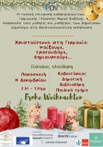 Η τοπική επιτροπή Νομού Κοζάνης καθηγητών γερμανικής γλώσσας, προσκαλεί του μαθητές Δημοτικών Σχολείων στην Χριστουγεννιάτικη Γιορτή που ετοιμάζει, την Παρασκευή 19 Δεκεμβρίου 2025 στο παιδικό τμήμα της Κοβενταρείου Βιβλιοθήκης. Η γιορτή θα περιλαμβάνει δραστηριότητες, τραγούδια, χειροτεχνίες παιχνίδια και κεράσματα, με πολλή όρεξη και άρωμα Χριστουγέννων από τις καθηγήτριες γερμανικών της πόλης μας.