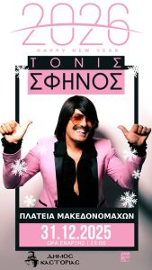 Ο Δήμος Καστοριάς σας προσκαλεί στην πιο λαμπερή εκδήλωση της χρονιάς! Ο μοναδικός Τόνις Σφήνος έρχεται στην Καστοριά για να υποδεχτούμε όλοι μαζί το 2026 με μουσική, χορό και ατελείωτο κέφι. Τοποθεσία: Πλατεία Μακεδονομάχων Ημερομηνία: Τετάρτη 31 Δεκεμβρίου 2025 Ώρα έναρξης: 23:00 Ελάτε να μετρήσουμε αντίστροφα για το νέο έτος σε μια βραδιά γεμάτη ρυθμό […]