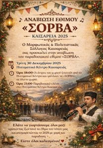 Ο Μορφωτικός & Πολιτιστικός Σύλλογος Καισαρειάς αναβιώνει και φέτος ένα από τα πιο χαρακτηριστικά και αγαπημένα έθιμα του τόπου, το παραδοσιακό έθιμο «Σόρβα», βάζοντας την Καισαρειά σε γιορτινό κλίμα λίγο πριν την εκπνοή του 2025. Η αναβίωση του εθίμου θα πραγματοποιηθεί την Τρίτη 30 Δεκεμβρίου 2025, με επίκεντρο το Πνευματικό Κέντρο Καισαρειάς. Σύμφωνα με το […]