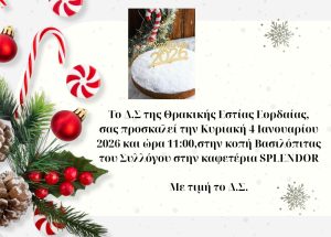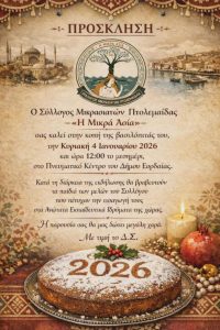 Ο Σύλλογος Μικρασιατών Πτολεμαΐδας σας προσκαλεί στην κοπή βασιλόπιτας που θα γίνει την Κυριακή 4 Ιανουαρίου 2026 και ώρα 12 το μεσημέρι στο Πνευματικό κέντρο του Δήμου Εορδαίας. Στην τελετή θα βραβευθούν τα παιδιά των μελών του Συλλόγου που πέτυχαν την εισαγωγή τους στα Ανώτατα εκπαιδευτικά ιδρύματα το 2025. Την εκδήλωση θα πλαισιώσουν η χορωδία […]