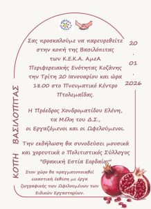 Την καθιερωμένη κοπή της βασιλόπιτάς τους διοργανώνουν τα Κ.Ε.Κ.Α. ΑμεΑ Περιφερειακής Ενότητας Κοζάνης, την Τρίτη 20 Ιανουαρίου 2026, στις 18:00, στο Πνευματικό Κέντρο Πτολεμαΐδας. Την εκδήλωση προσκαλούν η Πρόεδρος κ. Ελένη Χονδροματίδου, τα μέλη του Διοικητικού Συμβουλίου, οι εργαζόμενοι και οι ωφελούμενοι των Κ.Ε.Κ.Α. ΑμεΑ. Το πρόγραμμα θα πλαισιωθεί μουσικά και χορευτικά από τον Πολιτιστικό […]