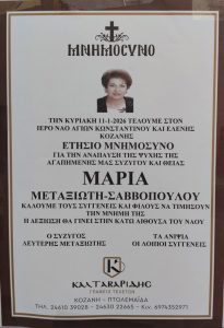Στον ιερό ναό Αγίων Κωνσταντίνου και Ελένης θα τελεστεί την Κυριακή 11 Ιανουαρίου, το ετήσιο μνημόσυνο της Μαρίας Μεταξιώτη Σαββοπούλου.