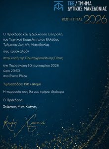 Kοπής της Πρωτοχρονιάτικης Πίτας του Τεχνικού Επιμελητηρίου Ελλάδας – Τμήματος Δυτικής Μακεδονίας, την Παρασκευή 30 Ιανουαρίου 2026 και ώρα 20:30, στο Event Plaza.