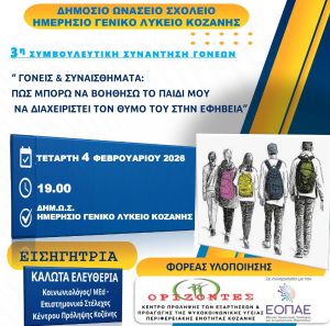 Το ΔΗΜ.Ω.Σ. ΗΜΕΡΗΣΙΟ ΓΕΝΙΚΟ ΛΥΚΕΙΟ ΚΟΖΑΝΗΣ, στο πλαίσιο λειτουργίας της Σχολής Γονέων, προγραμματίζει την 3η Συνάντηση, την Τετάρτη 4 Φεβρουαρίου 2026 και ώρα 19:00, στην Αίθουσα Εκδηλώσεων του σχολείου (Μακρυγιάννη 24, Κοζάνη) με την Κοινωνιολόγο, κυρία Καλώτα Ελευθερία, με θέμα: «Γονείς και συναισθήματα: Πώς μπορώ να βοηθήσω το παιδί μου να διαχειριστεί τον θυμό του […]