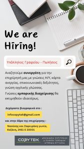 Η επιχείρηση COPYTEK, με έδρα την Κοζάνη, αναζητά συνεργάτη για τη θέση Υπαλλήλου Γραφείου – Πωλήσεων, στο πλαίσιο ενίσχυσης του ανθρώπινου δυναμικού της. Οι ενδιαφερόμενοι θα πρέπει να διαθέτουν γνώσεις χειρισμού Η/Υ, επικοινωνιακές δεξιότητες, γνώση αγγλικής γλώσσας, καθώς και κάρτα ανεργίας. Επιπλέον, γνώσεις εμπορικής διαχείρισης θα θεωρηθούν επιπρόσθετο προσόν. Η COPYTEK δραστηριοποιείται στους τομείς των […]
