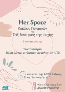 Αυτογνωσία, έκφραση, μοίρασμα. Ένα ταξίδι σε αθέατες διαδρομές. Η ΑΡΣΙΣ Κοζάνης και η Βέρα Δόγια (απόφοιτη ψυχολογίας ΑΠΘ) σε προσκαλούμε σε έναν κύκλο γυναικών για Ταξιδεύτριες της Ψυχής με όνομα “Her Space” που θα αποτελεί έναν φιλόξενο και ασφαλή χώρο με σκοπό να συναντηθούμε, να μοιραστούμε, να εκφραστούμε δημιουργικά και να συνδεθούμε- με τον […]