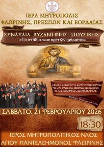 Η Ιερά Μητρόπολη Φλωρίνης, Πρεσπών και Εορδαίας προσκαλεί τους φίλους της βυζαντινής μουσικής σε μια κατανυκτική εκδήλωση με τίτλο: «Το στάδιον των αρετών ηνέωκται», αφιερωμένη στους ύμνους του Τριωδίου. Η εκδήλωση θα πραγματοποιηθεί το Σάββατο 21 Φεβρουαρίου 2026 και ώρα 6:30 το απόγευμα, στον Ιερό Μητροπολιτικό Ναό Αγίου Παντελεήμονος Φλώρινας. Τους ύμνους θα αποδώσει ο […]