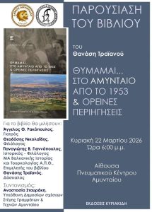 Ο Δήμος Αμυνταίου και η Στέγη Γραμμάτων & Τεχνών Αμυνταίου σας προσκαλούν στην παρουσίαση του βιβλίου του Θανάση Τραϊανού: «Θυμάμαι… στο Αμύνταιο από το 1953 & Ορεινές Περιηγήσεις» 📅 Κυριακή 22 Μαρτίου 2026 🕕 Ώρα: 6:00 μ.μ. 📍 Αίθουσα Πνευματικού Κέντρου Αμυνταίου Για το βιβλίο θα μιλήσουν: • Άγγελος Θ. Ρακόπουλος, Γιατρός • Θεοδόσης Νικολαΐδης, […]
