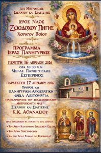 Ιερός Ναός Παμμεγίστων Ταξιαρχών Χορηγού Βοΐου.- Πρόγραμμα Ιερών Ακολουθιών επί τη εορτή της Ζωοδόχου Πηγής εις το πανηγυρίζον εξωκκλήσιον της Ζωοδόχου Πηγής»