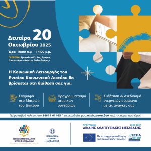 📅 Δευτέρα, 20 Οκτωβρίου 🕙 Από τις 10:00 π.μ. έως 14:00 μ.μ. 📍 Γραφείο 403, 2ος όροφος, Διοικητήριο «Κώστας Ταλιαδούρης» Η Κοινωνική Λειτουργός του Ενιαίου Κοινωνικού Δικτύου θα βρίσκεται στη διάθεσή σας για: 🤝 Εγγραφή στο Μητρώο του Δικτύου 🗓️ Προγραμματισμό ατομικών συνεδριών 📋 Συζήτηση και σχεδιασμό ενεργειών σύμφωνα με τις ανάγκες σας 📞 Για […]