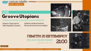 Η ΑΡΣΙΣ Κοζάνης, σας προσκαλεί σε μια μοναδική μουσική εμπειρία την Πέμπτη, στις 21:00, 25 Σεπτεμβρίου, στην αυλή του σπιτιού της με τους Groove Utopians! Οι Groove Utopians είναι μια νεοσύστατη μπάντα που δίνει νέα πνοή σε αγαπημένα pop τραγούδια, αναμειγνύοντας τα με funk ρυθμούς και jazz αυτοσχεδιασμούς. Με τη φωνή της Κατερίνας Τσιάρα και […]