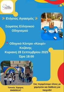 Το Τοπικό Συμβούλιο Κοζάνης του Σώματος Ελληνικού Οδηγισμού, με μεγάλη χαρά σας προσκαλεί στον Ετήσιο Αγιασμό , που θα γίνει την Κυριακή 28 Σεπτεμβρίου 2025 , στις 18:00 , στο Οδηγικό Κέντρο <<Κουρί>> Κοζάνης. Σας περιμένουμε όλους, μικρούς και μεγάλους , με χαμογέλα και διάθεση για παιχνίδι , για να ξεκινήσουμε μαζί μια νέα οδηγική […]