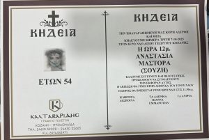 Έφυγε από τη ζωή σε ηλικία 54 ετών η Αναστασία Μάστορα (Σούζη). Η κηδεία της θα γίνει σήμερα Τρίτη 7/10 στις 12 το μεσημέρι στον Ι.Ν. Αγίου Γεωργίου Κοζάνης. Θερμά συλλυπητήρια στην οικογένειά της.