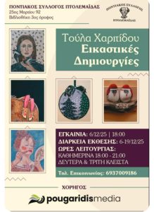 Ο Ποντιακός Σύλλογος Πτολεμαΐδας διοργανώνει και παρουσιάζει την έκθεση «Εικαστικές Δημιουργίες της Τούλας Χαριτίδου», η οποία ανοίγει τις πύλες της το Σάββατο 6 Δεκεμβρίου 2025, στον χώρο της βιβλιοθήκης του Συλλόγου (3ος όροφος, 25ης Μαρτίου 92). Τα εγκαίνια θα πραγματοποιηθούν στις 18:00, ενώ για το έργο της εικαστικού θα μιλήσει ο λογοτέχνης και δημοσιογράφος Μιχάλης […]