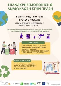 Την Πέμπτη 9 Οκτωβρίου 2025 στις 11:00–13:00, θα λάβει χώρα στο Δρέπανο Κοζάνης στον Περιμετρικό χώρο του Δημοτικού σχολείου, ενημερωτική εκδήλωση από τη ΔΙΑΔΥΜΑ σε συνεργασία με τον Δήμο Κοζάνης. Οι πολίτες θα μπορούν να παραδώσουν επί τόπου εκτός των τυπικών υλικών συσκευασίας (χαρτί, γυαλί, πλαστικό, αλουμίνιο), απόβλητα ειδικών κατηγοριών όπως ηλεκτρικές & ηλεκτρονικές μικροσυσκευές, […]