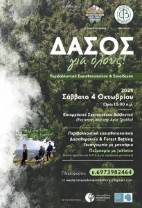 Το Πρότυπο Δάσος Δυτικής Μακεδονίας, σε συνεργασία με τον Δήμο Βελβεντού και με την υποστήριξη του Διεθνούς και Μεσογειακού Δικτύου Πρότυπων Δασών, διοργανώνει το Σάββατο 04 Οκτωβρίου 2025 τη δράση: «Δάσος για Όλους: Εκδρομή Ευαισθητοποίησης, Ενημέρωσης και Δασοθεραπείας», στην περιοχή Σκεπασμένο του Δήμου Βελβεντού. Η δράση απευθύνεται στο ευρύ κοινό και έχει ως στόχο την […]