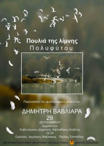 Εκδήλωση για την παρουσίαση του φωτογραφικού project «Πουλιά της λίμνης Πολυφύτου» του Δημήτρη Βαβλιάρα, θα πραγματοποιηθεί σήμερα Δευτέρα 29 Σεπτεμβρίου 2025, στις 18:00, στο Αμφιθέατρο της Κοβενταρείου Δημοτικής Βιβλιοθήκης Κοζάνης. Ομιλητές της εκδήλωσης θα είναι ο Δημήτρης Βαβλιάρας και ο Παύλος Σαπαλίδης. Η είσοδος για το κοινό είναι ελεύθερη.