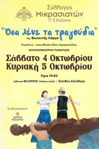 Στην αίθουσα “ΦΙΛΙΠΠΟΣ” η θεατρική παράσταση του Μικρασιατικού Συλλόγου Π.Ε. Κοζάνης, λόγω δυσμενών καιρικών συνθηκών. Η είσοδος ελεύθερη χωρίς κράτηση θέσεων.