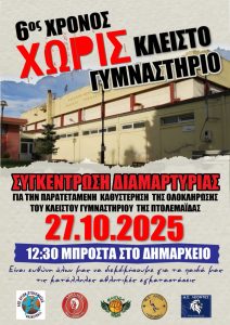 Έξι χρόνια χωρίς Κλειστό Γυμναστήριο για μια επαρχιακή πόλη, για τα παιδιά, τους πολίτες και τις ομάδες της, μοιάζουν με αιώνα. Και για να μη ζήσουμε και άλλους «αιώνες» χαμένων ευκαιριών για το μέλλον της πόλης μας, σας καλούμε στη συγκέντρωση διαμαρτυρίας μπροστά στο Δημαρχείο Εορδαίας, τη Δευτέρα 27 Οκτωβρίου 2025 και ώρα 12:30 μ.μ. […]