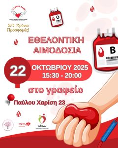 Την Τετάρτη 22 Οκτωβρίου 2025 από τις 15:30 – 20:00, (προσέλευση μέχρι 19:30), στο γραφείο του Συλλόγου, Π. Χαρίση 23 με την Αιμοδοσία του Γ.Ν. Κοζάνης. Για ραντεβού 6977337561 “A dream you dream alone is only a dream. A dream you dream together is reality.” John Lennon Ελάτε να ονειρευτούμε μαζί …ένα κόσμο […]