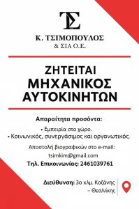 Ζητείται Μηχανικός Αυτοκινήτων από την εταιρεία Κ. Τσιμόπουλος & ΣΙΑ Ο.Ε. .