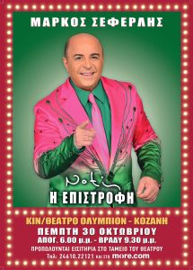 Ο Μάρκος Σεφερλής στην Κοζάνη στο κιν/θεατρο ΟΛΥΜΠΙΟΝ την Πέμπτη 30 Οκτωβρίου!2 παραστάσεις 18.00 & 21.30 Η προπώληση έχει αρχίσει στο more.com https://www.more.com/gr-el/tickets/theater/notis-i-epistrofi-1/ Περισσότερα —> www.cineolympion.gr
